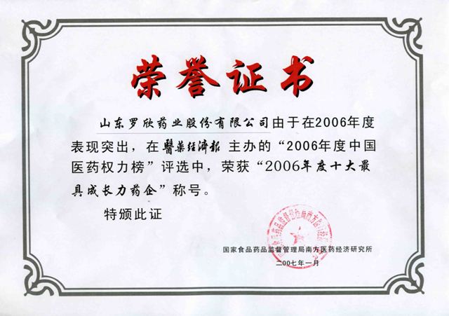 由于2006年年度表現(xiàn)突出,在國家食品藥品監(jiān)督管理局南方醫(yī)藥經(jīng)濟研究所“2006年中國醫(yī)藥權(quán)力榜”評選中,榮獲“2006年最具成長力藥企”稱號。