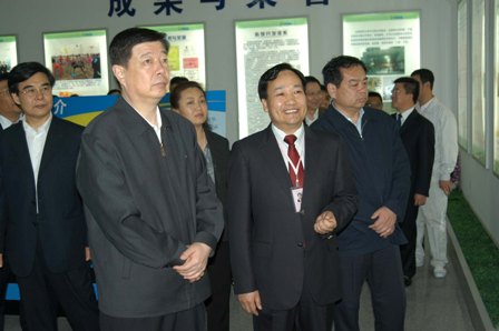 2008年4月7日,山東省委書記姜異康(前排右三)在山東省委常委、秘書長王敏(前排右一)、臨沂市委書記連承敏(前排右四)陪同下視察羅欣藥業(yè)。羅欣藥業(yè)董事長劉保起(前排右二)向姜書記介紹了公司發(fā)展情況。