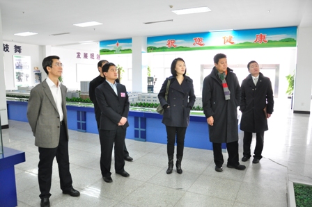 上圖為北京惠旭金石投資公司楊晨董事(右三)一行參觀公司展廳時的情景,市食品藥品監督管理局催增久局長(左一)陪同上圖為北京惠旭金石投資公司楊晨董事一行與公司管理層在會議室進行座談時的情景