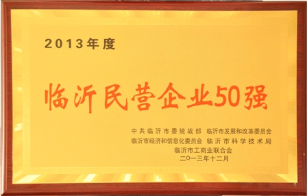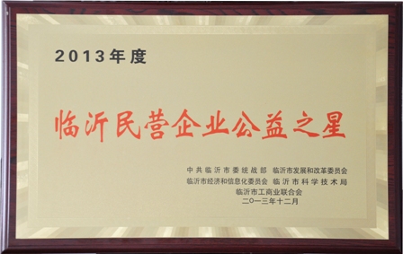 2014年1月7日,臨沂市工商聯在臨沂市政府組織召開了臨沂市工商聯八屆三次執委會議暨市光彩事業促進會二屆一次理事會議。大會表彰了全市工商聯系統先進單位、個人,我公司榮獲2013年度“民營企業50強”、“民營企業公益之星”兩個獎項。