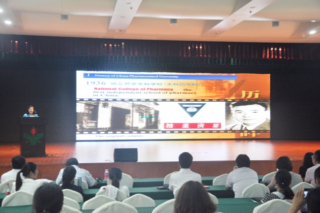 上圖為中國藥科大學國際醫藥商學院院長馬愛霞在羅欣會堂進行宣講時的情景